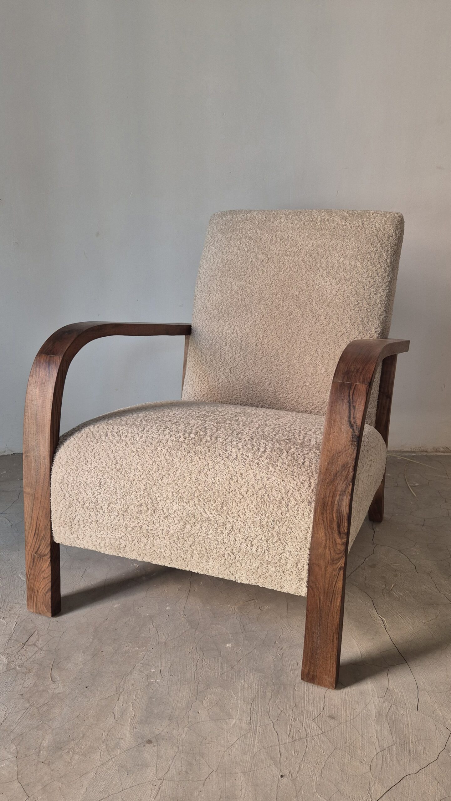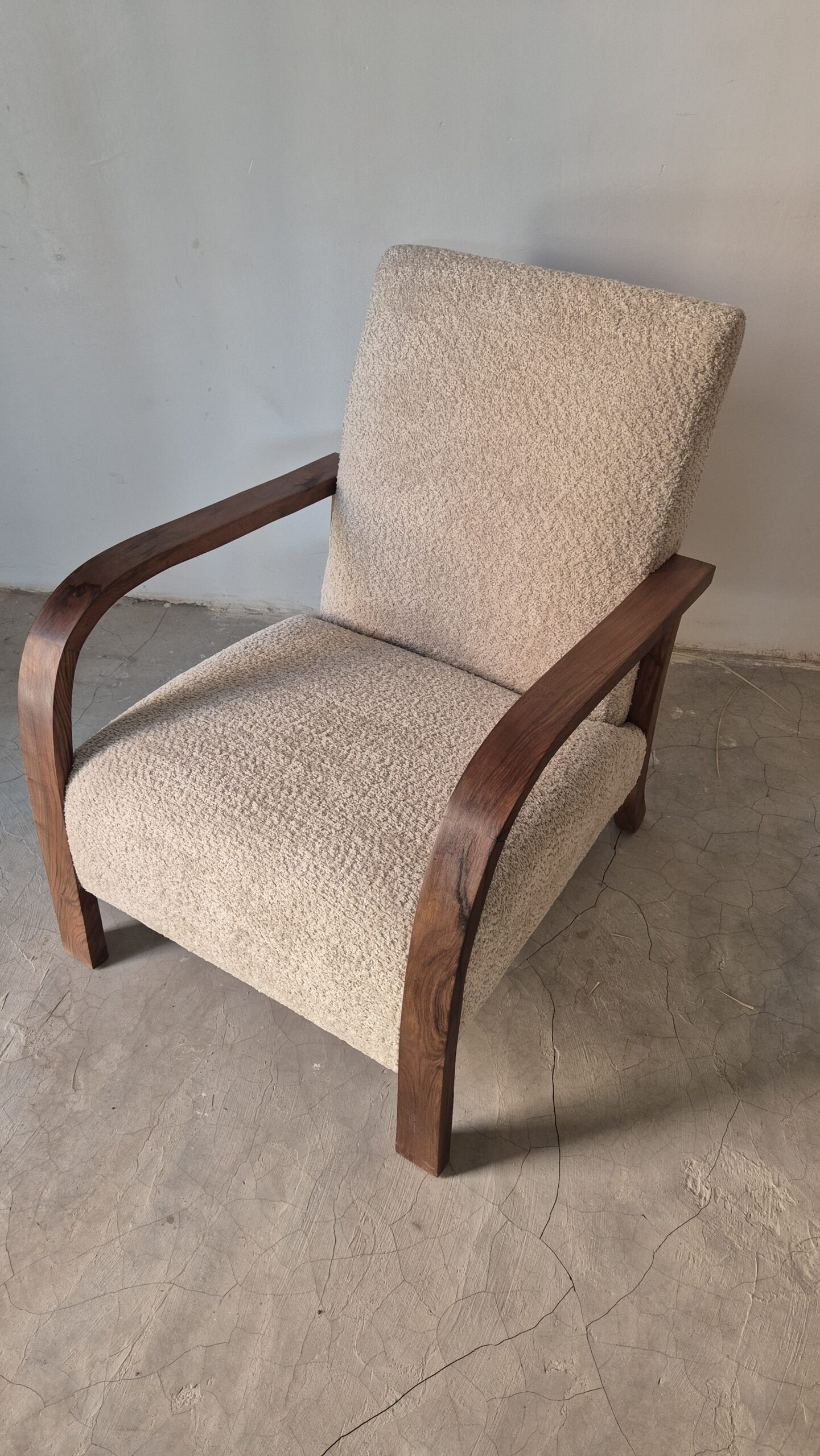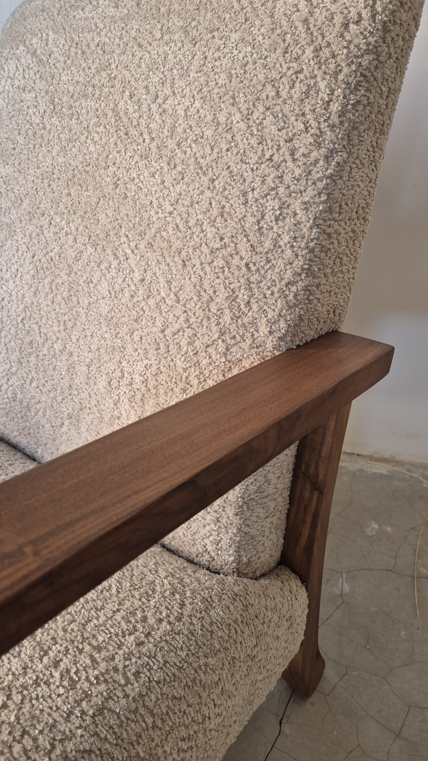 Fauteuil en bois de noyer et tissu bouclette