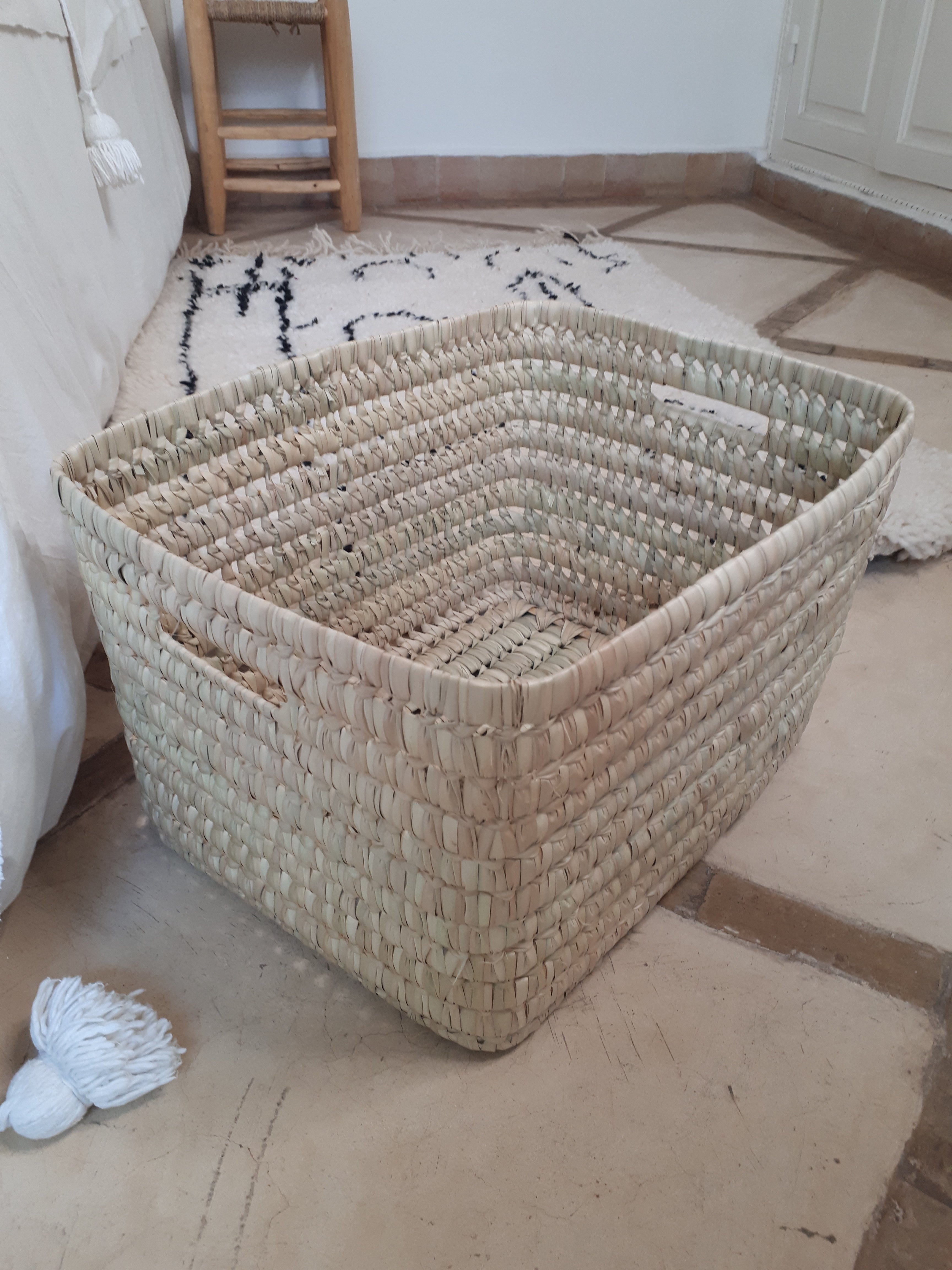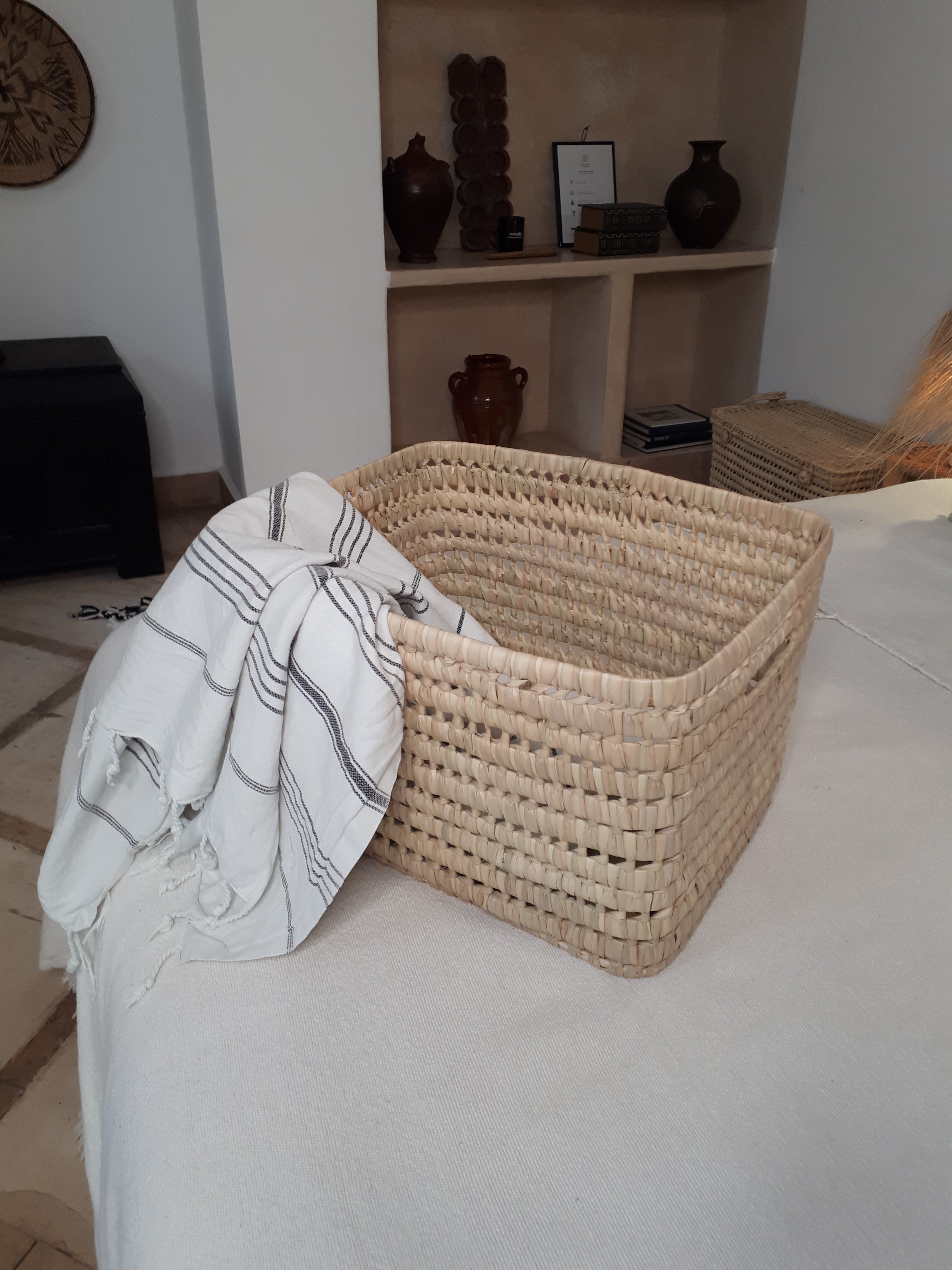 Ce grand panier en feuilles de palmier est idéal pour ranger les choses du quotidien, votre linge. Vous pouvez aussi vous en servir pour ranger le joyeux bazar de vos enfants, ou des accessoires pour la salle-de-bain.- Dimensions : 40 x 30 cm, hauteur 25 cm